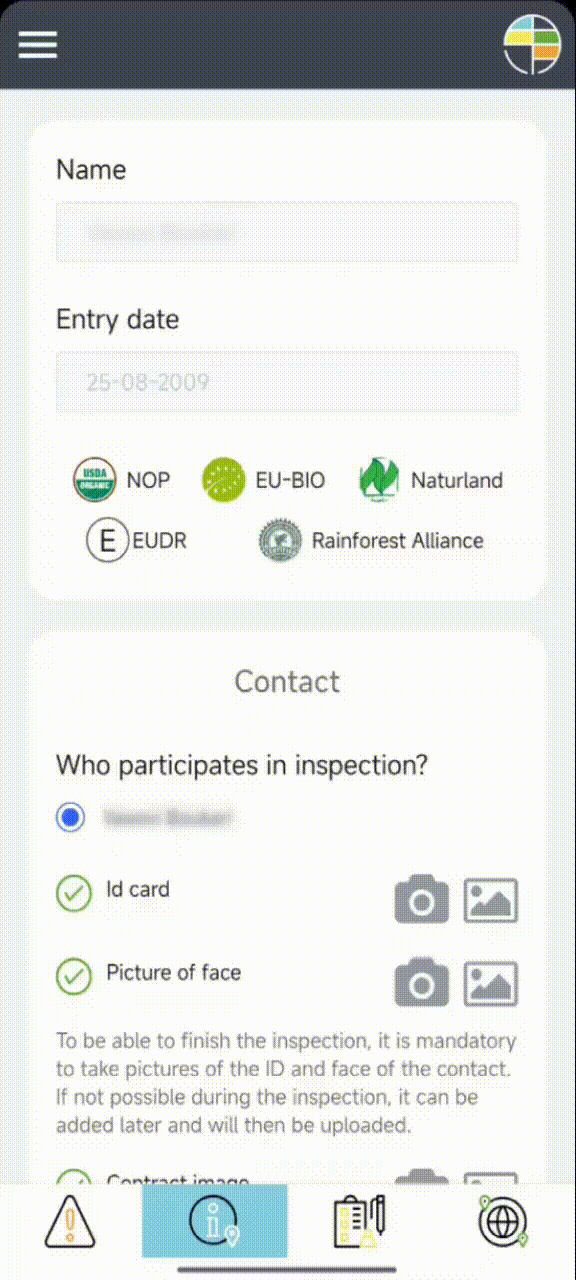 Contacts Navigation: > You must choose with whom the inspection was conducted and have the images Identification card Face Contract with the organization Additionally, the producer must authorize the use of data. Map Any polygon record must be ...