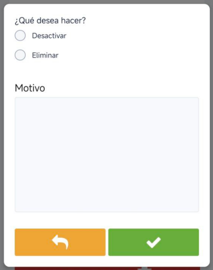 Antes de guardar, debes escribir un motivo de la desactivación o eliminación (por ejemplo: “Vendida”, “No se usa”, etc.). Este campo es obligatorio.