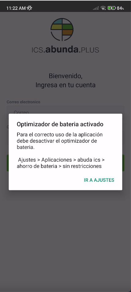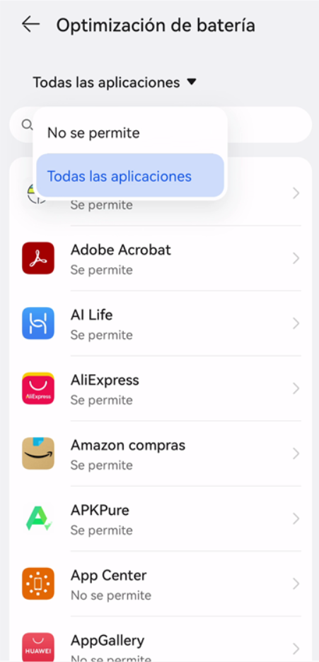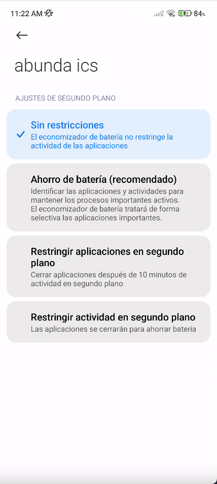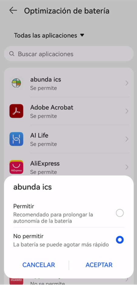 En aplicación de abunda ics, elegir la opción No permitir para que la optimización de batería no cierre los servicios que utiliza la aplicación de abunda ics.