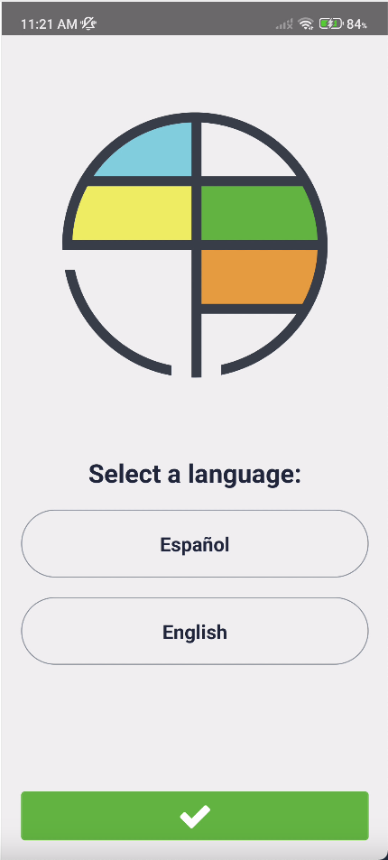 Al iniciar la aplicación por primera vez, se debe elegir el idioma de preferencia: