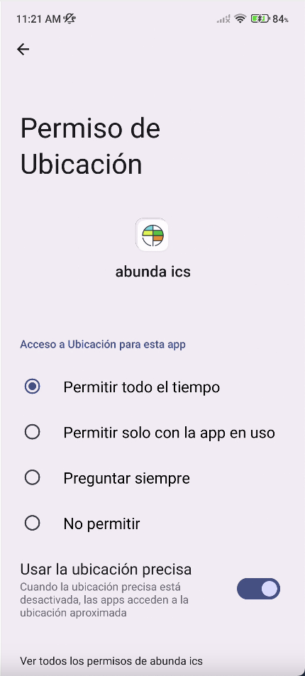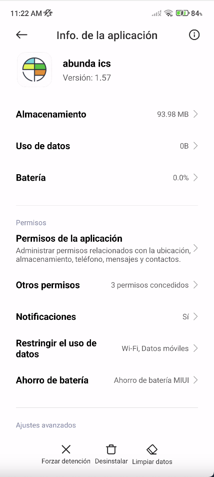 Para que la aplicación de abunda funcione correctamente, deben activarse todos los permisos necesarios. La aplicación solicita los permisos de manerea automatizada. Si quiere modificar los permisos manualmente, debe navegar a Configuración > Aplicaciones > Gestionar aplicaciones > abunda ics